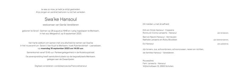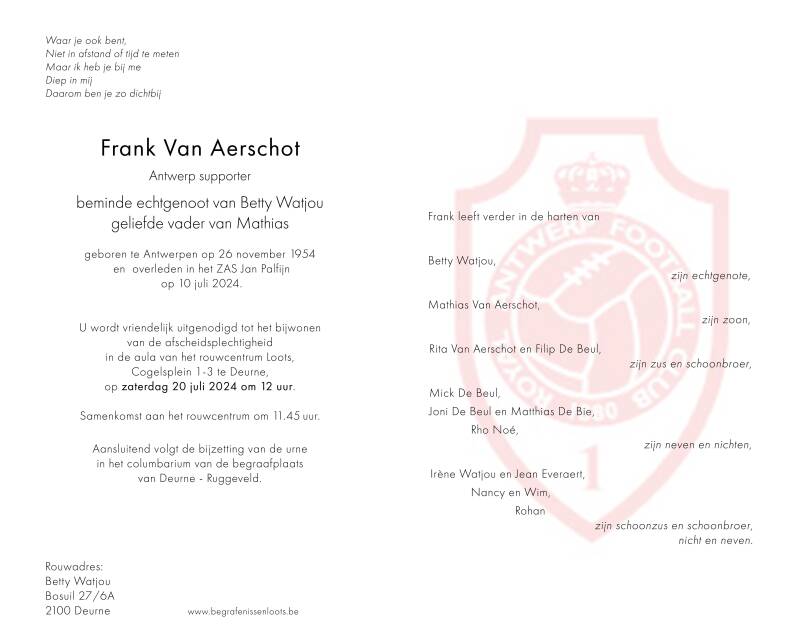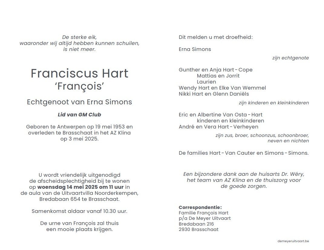 Innige deelneming voor vrienden en familie . Sterkte in deze moeilijke dagen