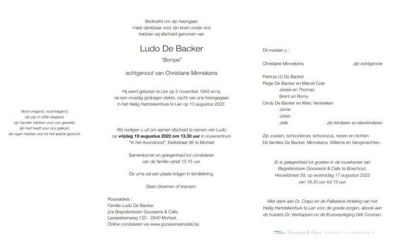 Mijn oprechte deelneming bij het overlijden van mijn beste vriend Ludo , veel sterkte aan de familie en vrienden.